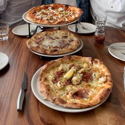 Firstly, I'd like to say that I really don't think my review can give a pizza place like this justice since I didn't have any pizza. I did however have their chicken pesto aioli sandwich, and it was absolutely amazing. I'd like to point out that the sandwich itself came cold, which surprised me a little. I don't know why but I was expecting it to be hot and it wasn't. It's not a huge deal, but that's the only reason I'm giving this 4/5 starts instead of 5 (that and I had to flag the waiter down twice, more below). Taste wise though it was perfect, though I'm on the fence if I'd order it again knowing it's more of a cold sandwich. The salad was really good too, for a basic side salad. It wasn't just dry iceberg or something. My friend ordered the red pizza, and I forgot to take a photo of it but it looked delicious. Being lactose intolerant I didn't have any of it, but I was crazy jealous because it looked wonderful. The service was good. It was very busy, and there was a 20 minute wait (we had a reservation though). I had to flag the waiter down twice to get some refills on my beverage, but overall good, friendly service. I'd definitely come back again and bring another friend here. The pizza *looked* great, and my lunch friend really enjoyed it so I'm sure other pizza fans will get a big smile out of this place too!